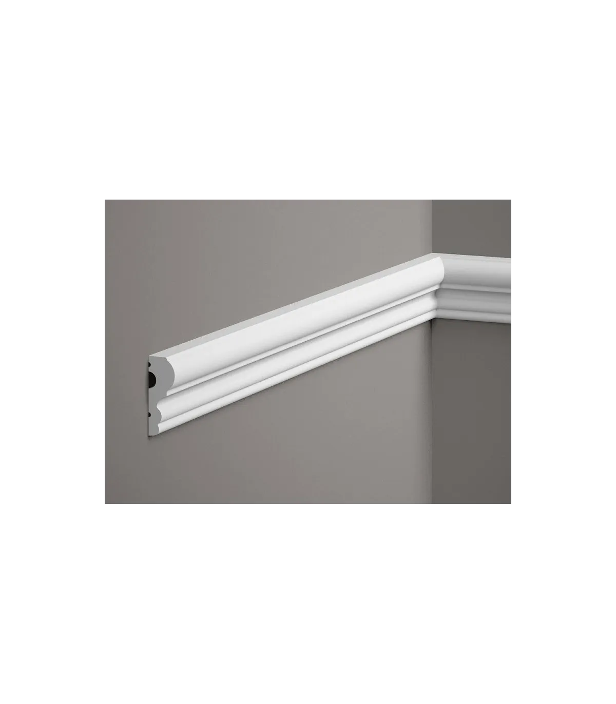 Nástěnná lišta MD325 je minimalistický design s decentním zdobením uprostřed soklové lišty. Profil byl vyroben z extrémně lehké pěny ProFoam, která díky své hmotnosti umožňuje bezproblémovou instalaci v jakékoli výšce stěny. MD010 bude fungovat jak jako nástěnná a odřezávací lišta, ale také jako prvek větší dekorativní kompozice. Soklová lišta má vodotěsné vlastnosti, takže není problém s její instalací v interiérech vystavených neustálému kontaktu s vlhkostí. Dobře si poradí i s UV zářením – při intenzivním slunci se nedrolí a nežloutne. Můžete si být jisti, že i po mnoha letech používání si nástěnná lišta zachová svůj bezvadný vzhled. Délka je 2,0 m.