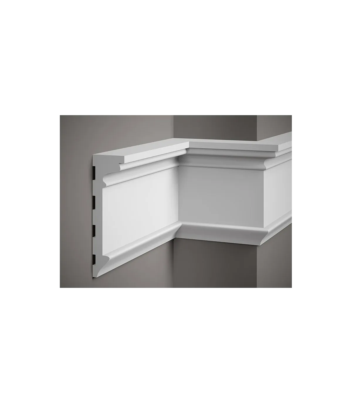 Nástěnná lišta MDD315 je minimalistický design s decentním zdobením uprostřed soklové lišty. Profil byl vyroben z extrémně lehké pěny ProFoam, která díky své hmotnosti umožňuje bezproblémovou instalaci v jakékoli výšce stěny. MDD315 bude fungovat jak jako nástěnná a odřezávací lišta, ale také jako prvek větší dekorativní kompozice. Soklová lišta má vodotěsné vlastnosti, takže není problém s její instalací v interiérech vystavených neustálému kontaktu s vlhkostí. Dobře si poradí i s UV zářením – při intenzivním slunci se nedrolí a nežloutne. Můžete si být jisti, že i po mnoha letech používání si nástěnná lišta zachová svůj bezvadný vzhled. Délka je 2,0 m.