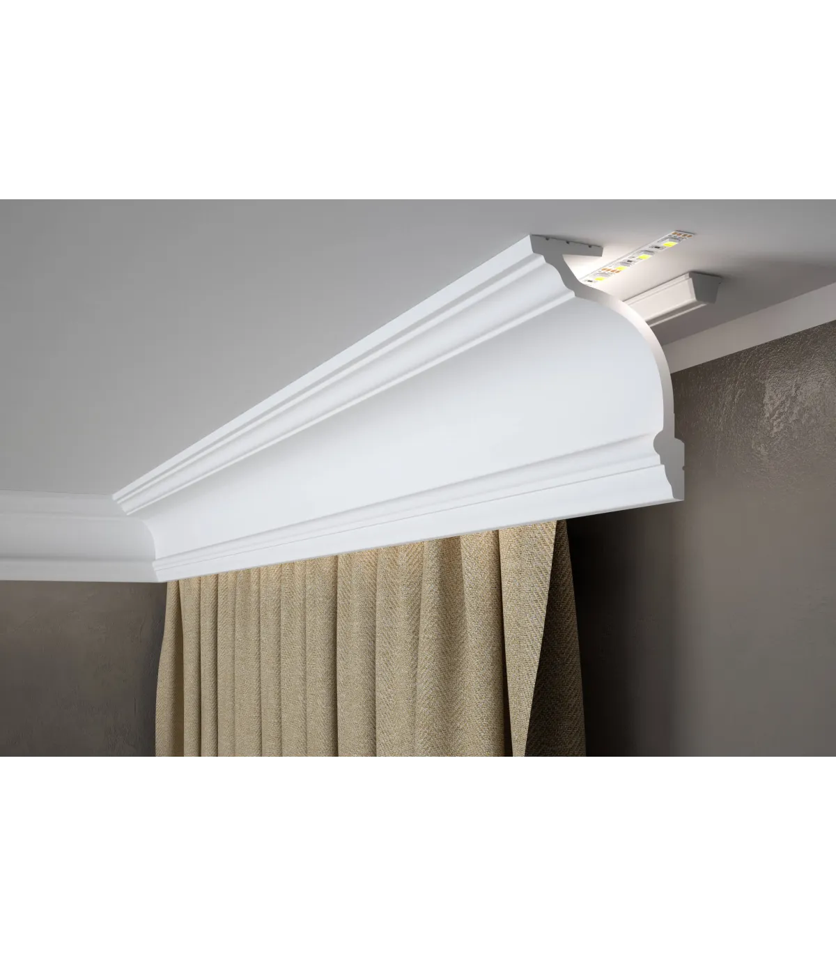 Lišta v moderním designu určená speciálně pro zakrytí garnýže. Představuje elegantní alternativu k zakrytí často nevzhledných garnýž pomocí sádrokartonových nebo dřevěných desek. Je lehká a umožňuje umístění dnes tolik oblíbeného LED osvětlení.