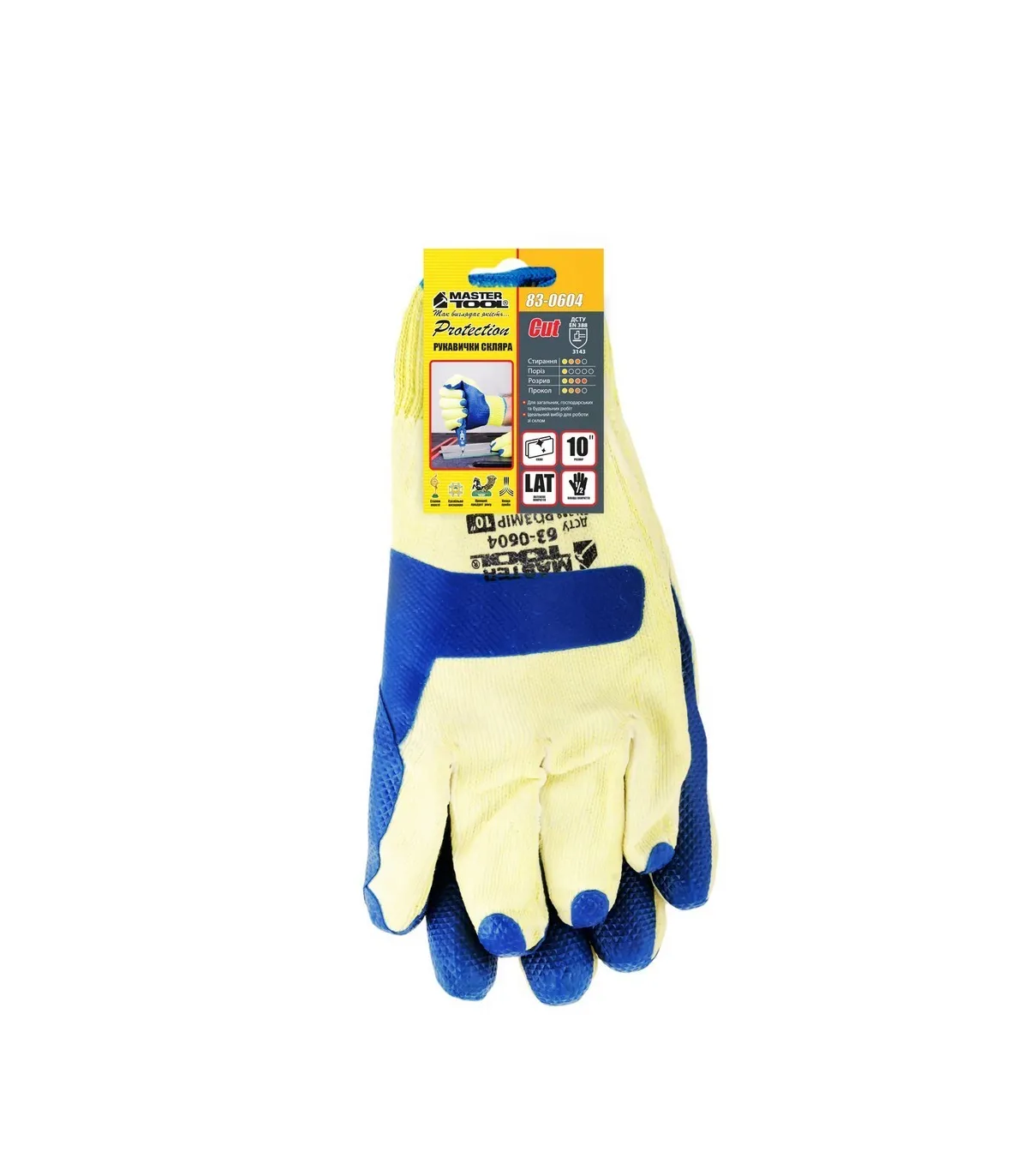Rukavice pracovní MASTERTOOL 83-0604 z bezešvé pletené bavlny s přírodním latexovým povrchem, ochranou kloubů žlutá/modrá 10,5"
