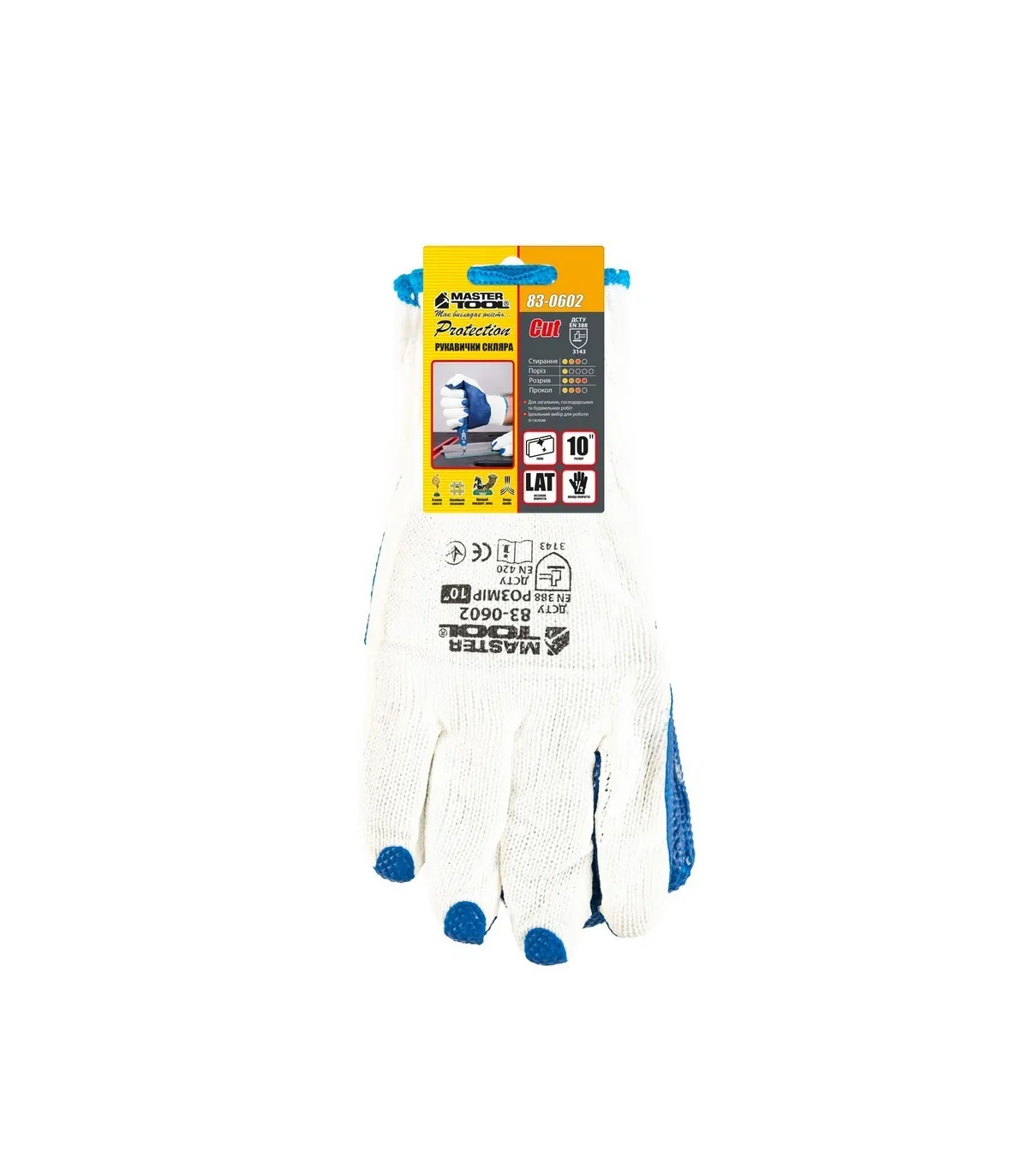 Rukavice pracovní MASTERTOOL 83-0602 z bezešvé pletené bavlny s přírodním latexovým povrchem bílá/modrá 10,5"