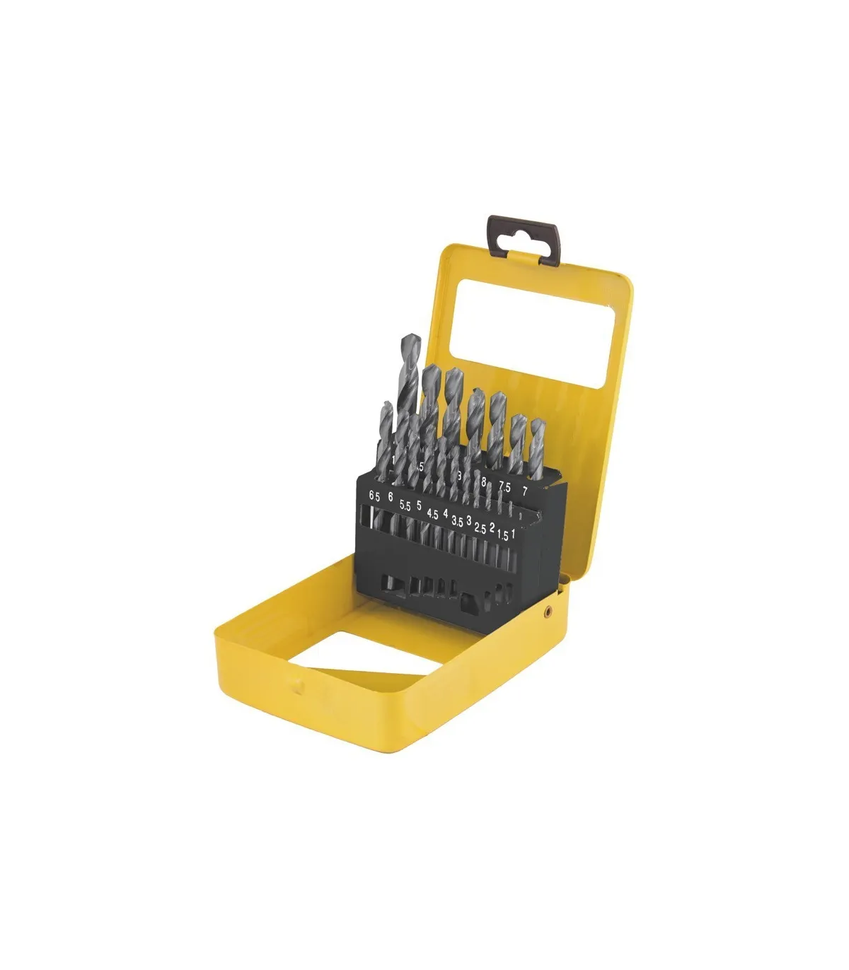 Vyrobeno z rychlořezné oceli HSS s tvrdostí HRC 60-62 a úhlem broušení 118°, obsahuje vrtačky o průměrech od 1.0 do 10.0 mm.